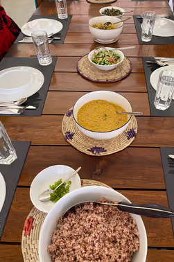W Samma Samadhi jedzenie staje się kojącym doświadczeniem. Ajurwedyjska kuchnia łączy przyjemność, uważność i zdrowie, przygotowywana codziennie ze świeżych, regionalnych składników. Pachnące przyprawy, kolorowe warzywa i tropikalne owoce uwalniają swoje aromaty w tradycyjnych daniach Tri-Dosha, które harmonizują ciało i umysł. Potrawy są głównie roślinne, z opcją dodania świeżo złowionej ryby lub kurczaka. Goście Ajurwedy otrzymują menu dostosowane do Dosha, zgodnie z zaleceniami ajurwedyjskiego lekarza.